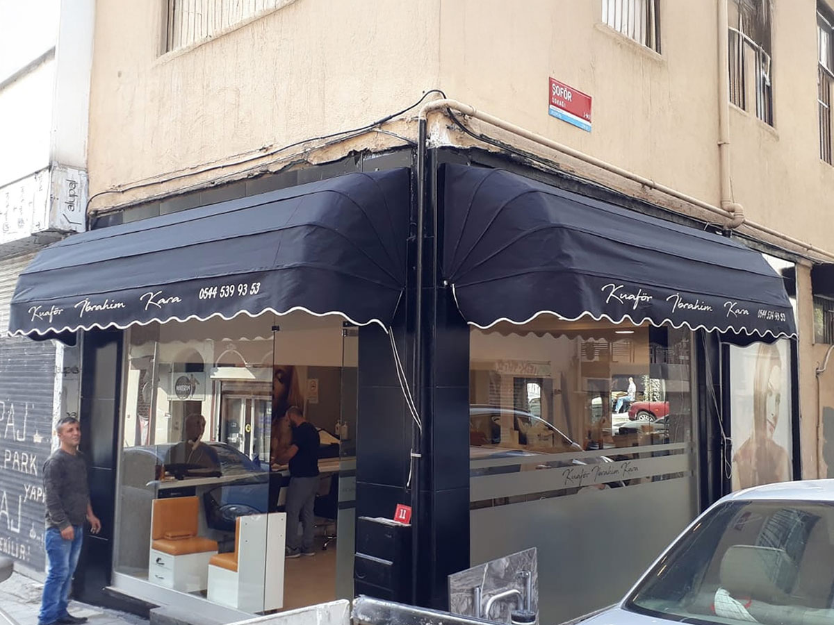 Cafe ve restoran girişlerinde nostaljik bir atmosfer yaratır. Özellikle butik işletmeler ve tarihi binalarda tercih edilir. Dükkan vitrinlerinde ürünleri güneşten korurken mağazaya klasik bir görünüm kazandırır. Otel ve butik işletmelerin girişlerinde zarif bir karşılama alanı oluşturur.